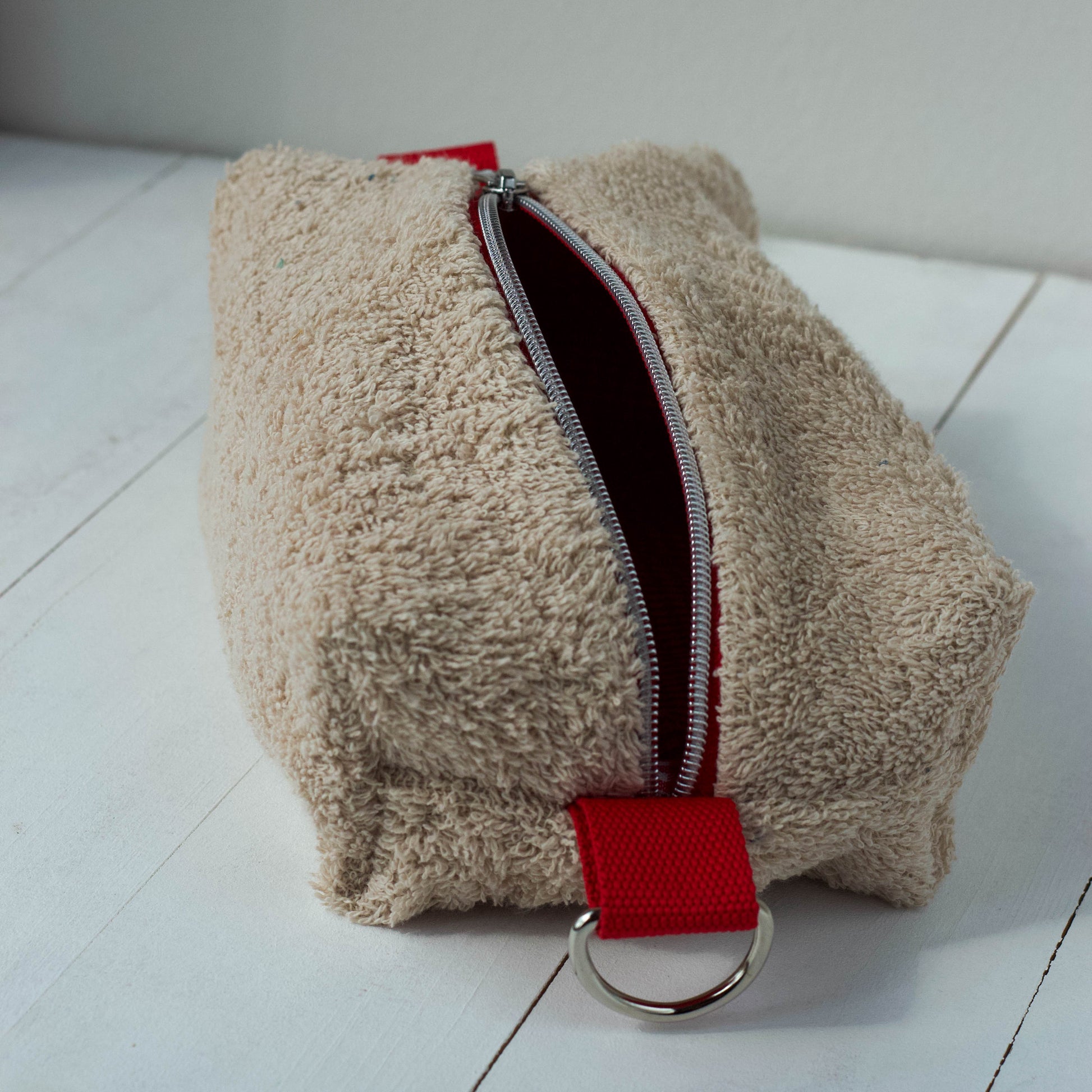 Praktische Boxy Bag aus Frottee mit rotem Reißverschluss und Schlaufen zum aufhängen. Perfekt für den Sporturlaub. Innenfutter aus Baumwollstoff.
