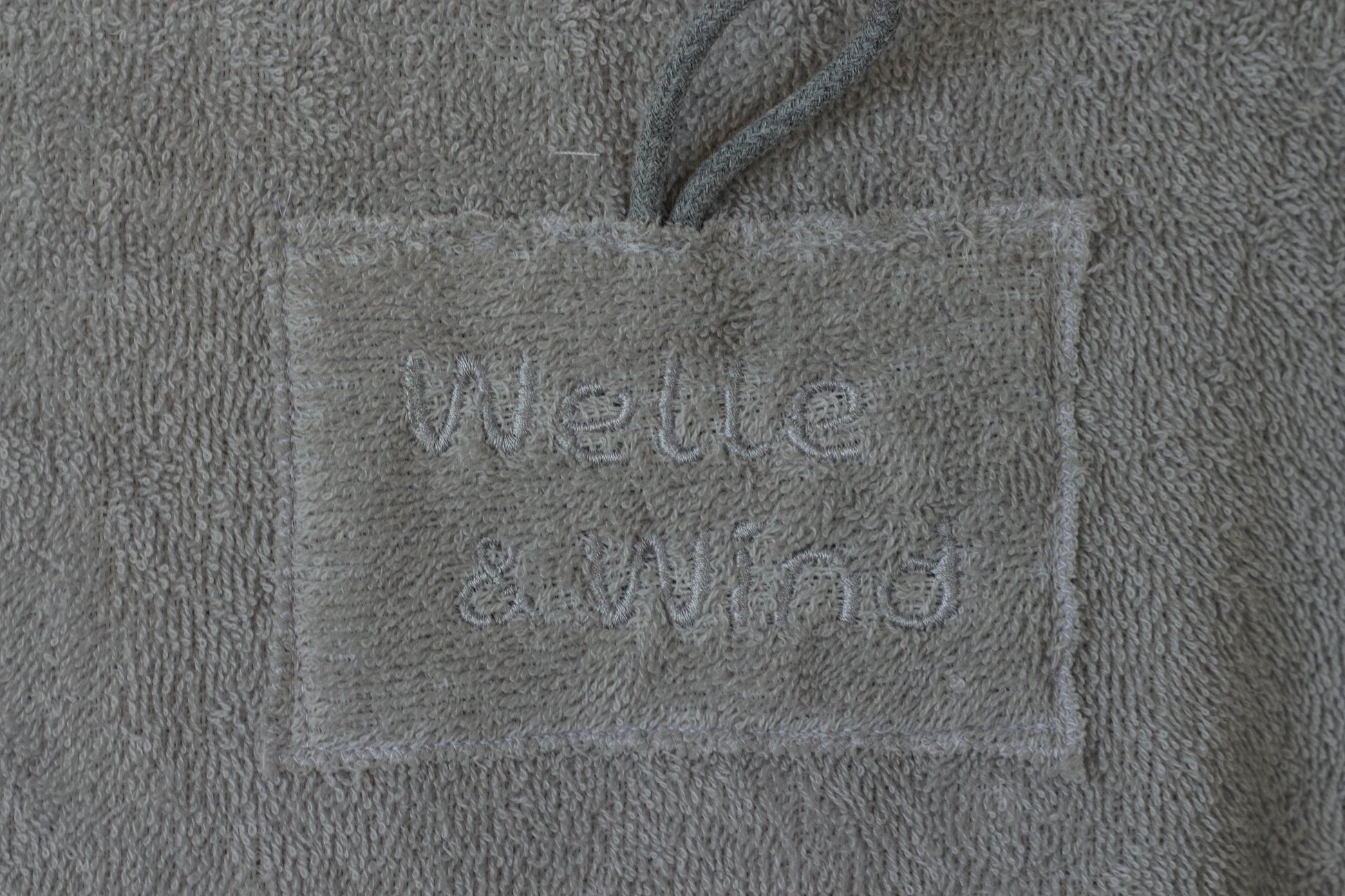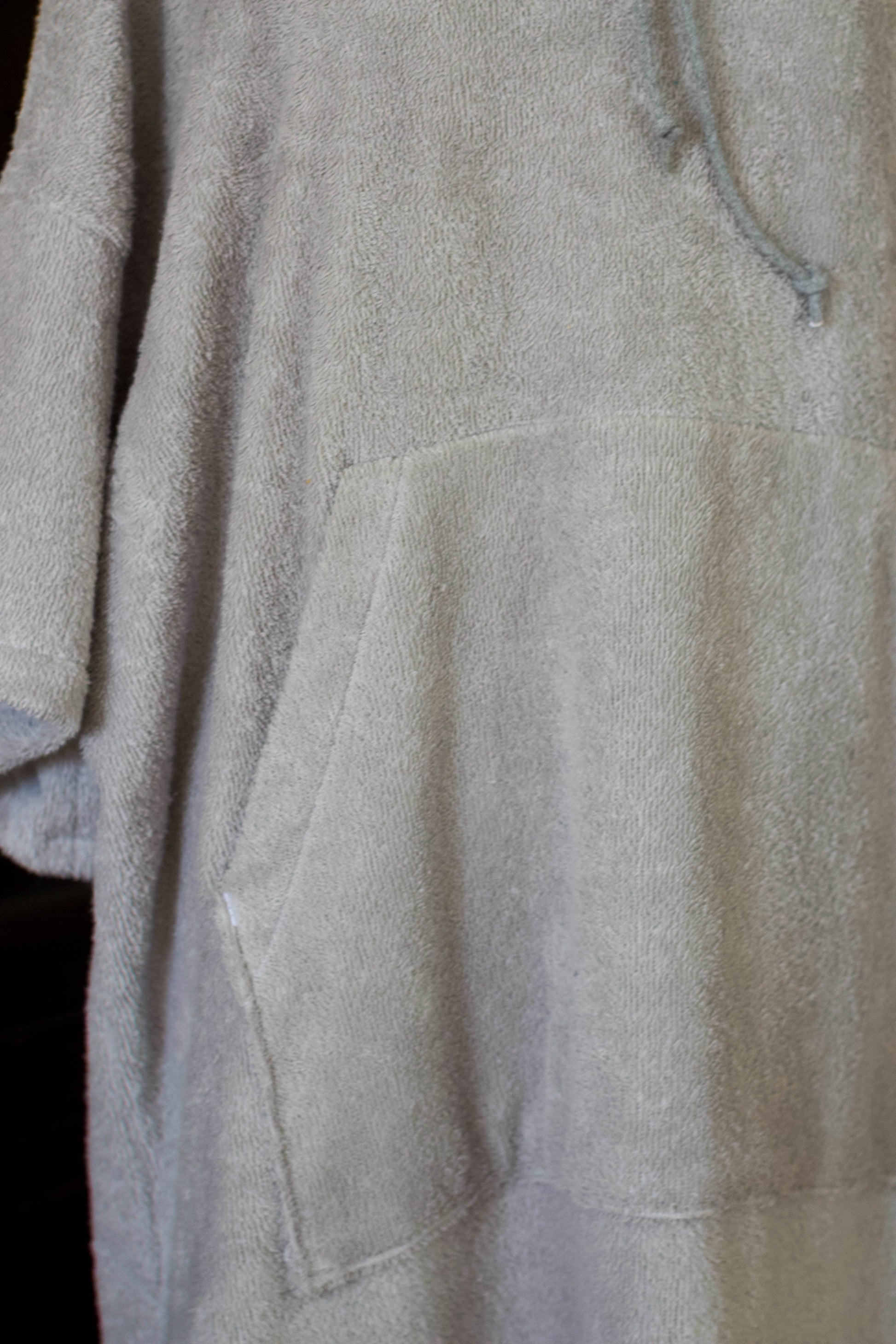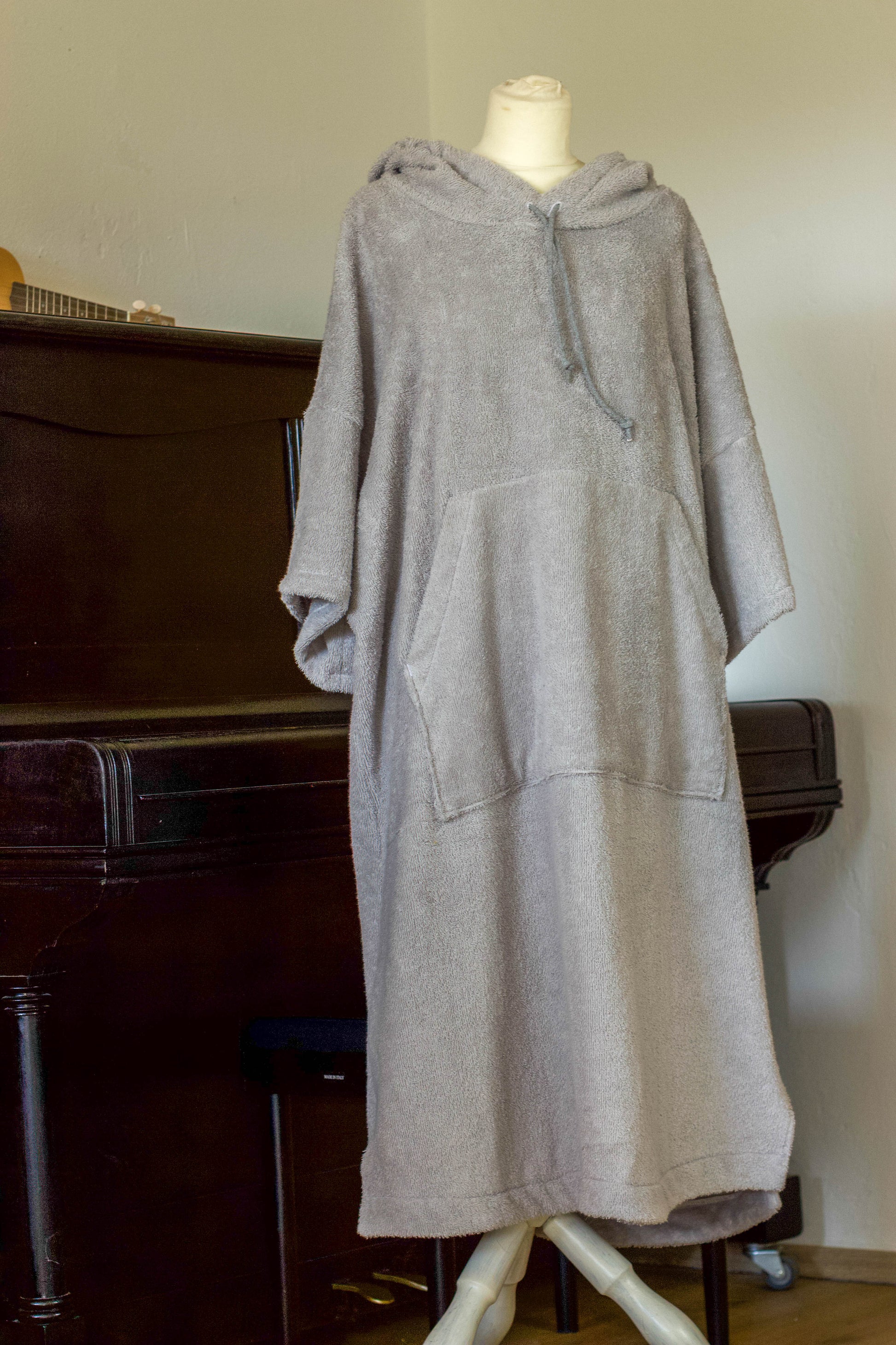 genäht aus hellgrauen, hochwertigem Frottee in übergroßer Passform. Perfekt nach dem surfen, kiten, stand up paddeln, im Urlaub, beim Campen oder einfach zu Hause. Eine Lasche zum aufhängen ist aussen unter der Kapuze angebracht.Groß genug um ihn über dem Neoprenanzug zu tragen. Ein umziehen ohne neugierige Blicke ist problemlos möglich, dank der grossen Armöffnungen. In der großen Bauchtasche lässt sich problemlos nötiger Kleinkram, Bikinioberteil oder andere Dinge verstauen.