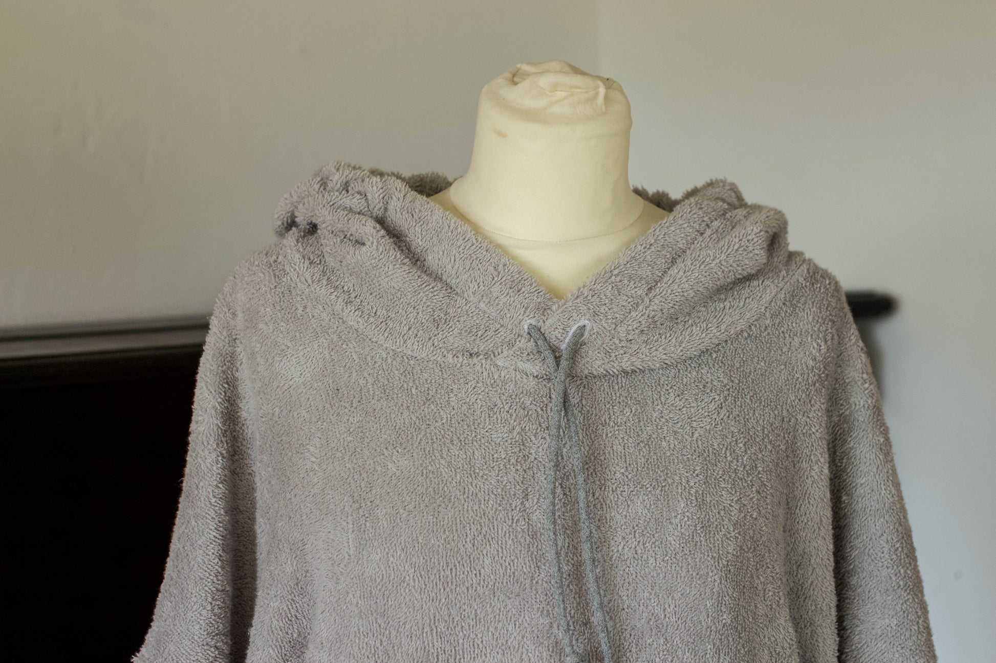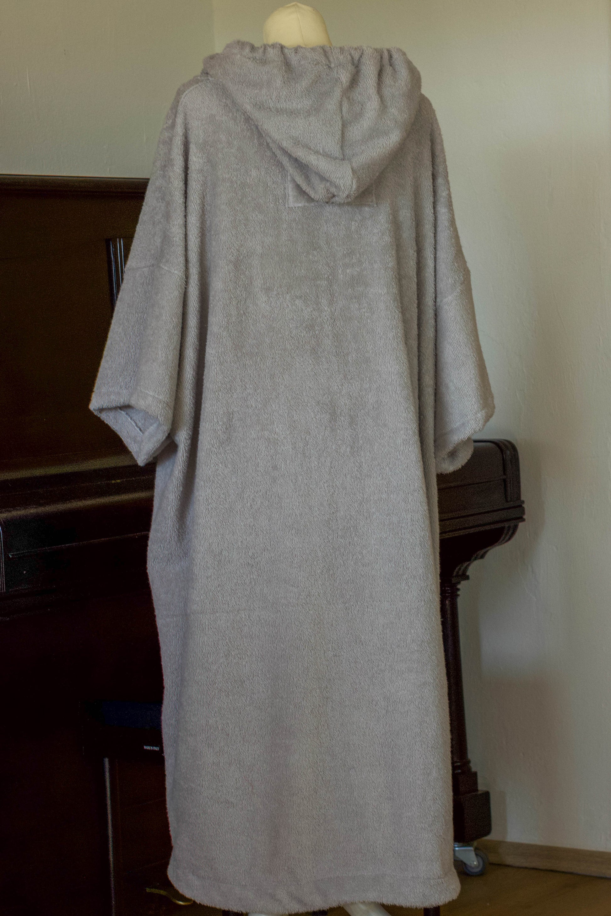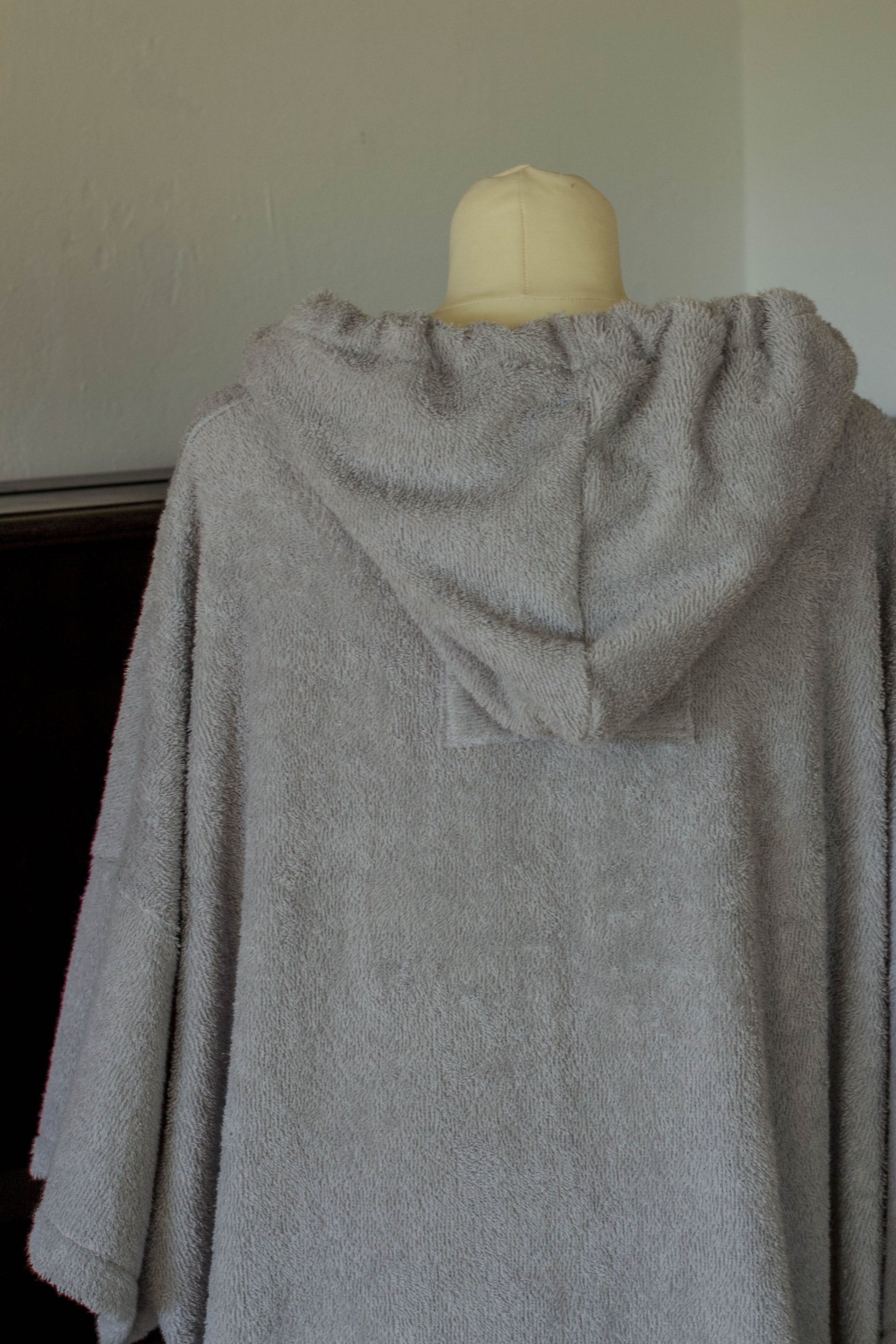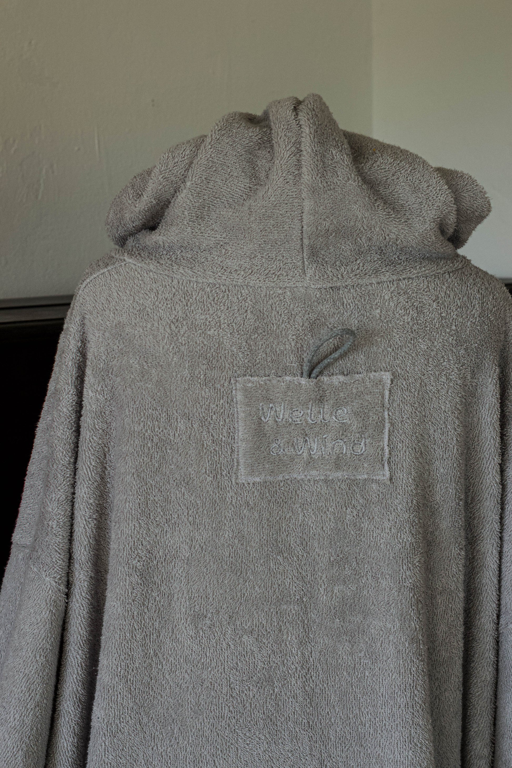 genäht aus hellgrauen, hochwertigem Frottee in übergroßer Passform. Perfekt nach dem surfen, kiten, stand up paddeln, im Urlaub, beim Campen oder einfach zu Hause. Eine Lasche zum aufhängen ist aussen unter der Kapuze angebracht.Groß genug um ihn über dem Neoprenanzug zu tragen. Ein umziehen ohne neugierige Blicke ist problemlos möglich, dank der grossen Armöffnungen. In der großen Bauchtasche lässt sich problemlos nötiger Kleinkram, Bikinioberteil oder andere Dinge verstauen.