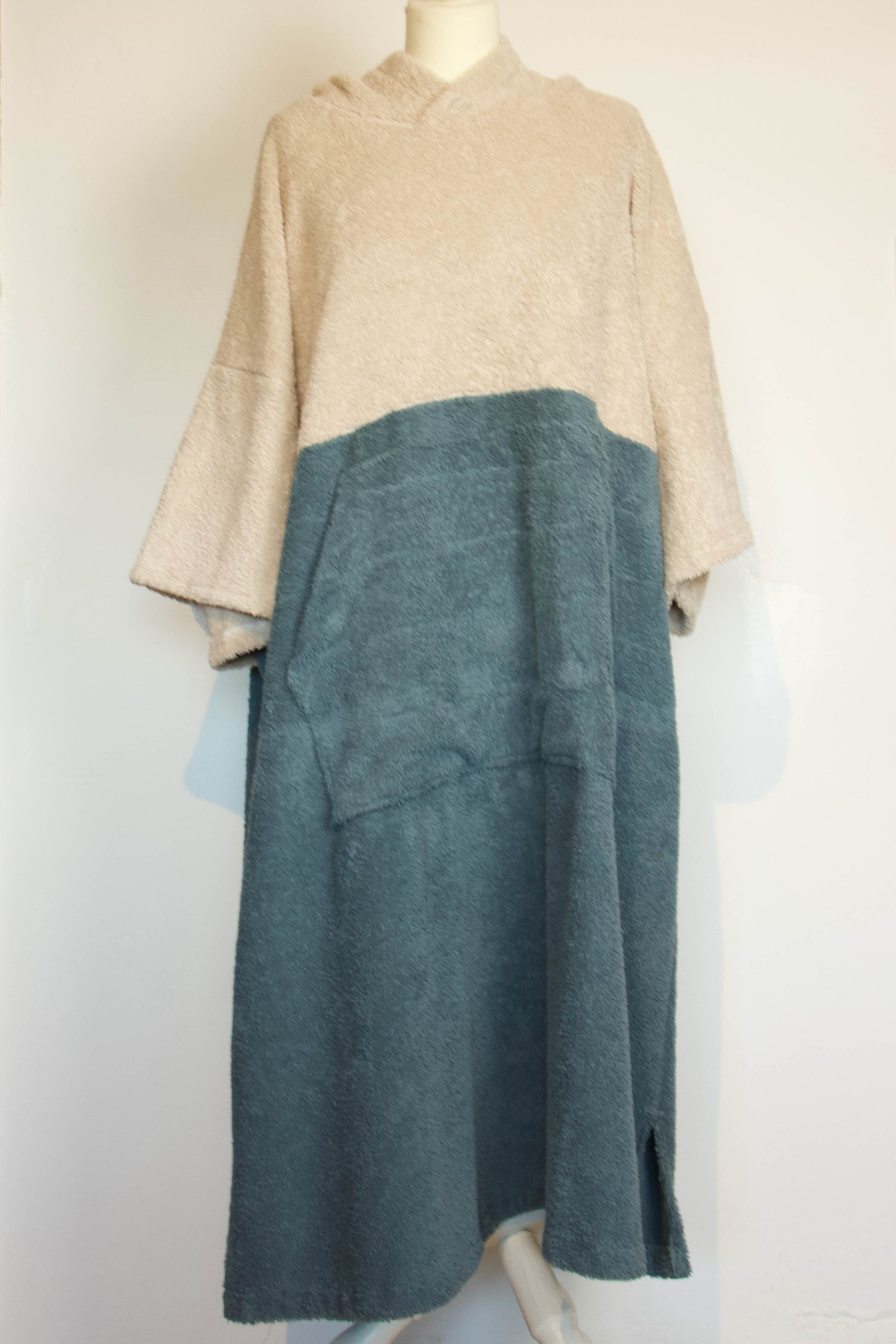 Groß genug um ihn über dem Neoprenanzug zu tragen. Ein umziehen ohne neugierige Blicke ist problemlos möglich, dank der grossen Armöffnungen.